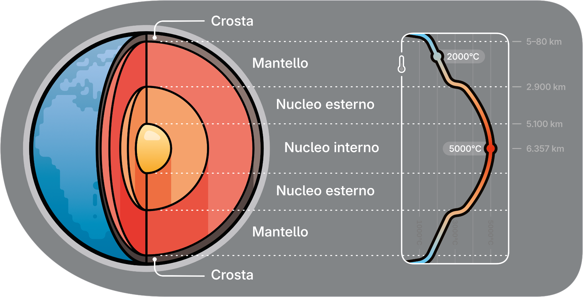 Nella crosta terrestre di norma aumenta di circa 30°C ogni chilometro (km). Nelle aree vulcaniche può essere maggiore di 150°C ogni km. Vulcani, terremoti, ma anche sorgenti termali, polle gorgoglianti, geyser e fumarole, sono espressione del calore interno della Terra e dell’energia geotermica in esso racchiusa.