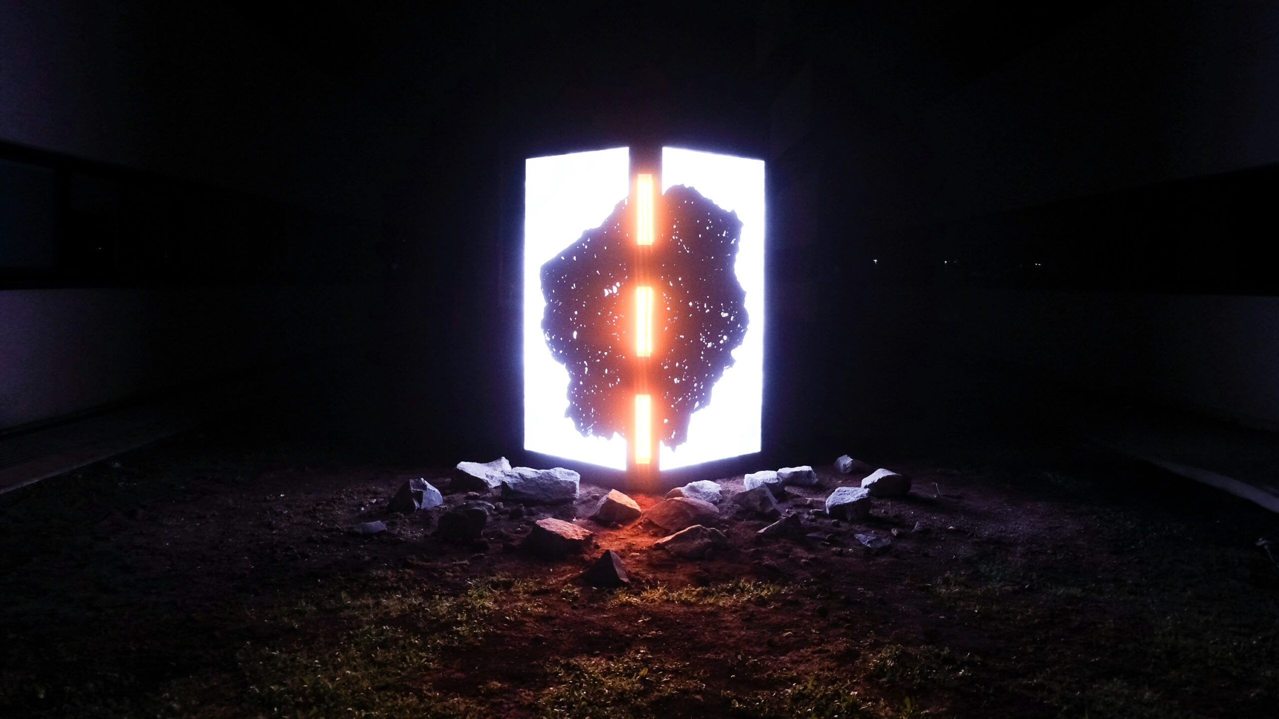 L’installazione si compone di due parti: una monolitica scultura esterna digitale, costituita da due grandi ledwall, separati tra loro da lampade riscaldanti, sui quali scorrono video e immagini per raccontare il calore terrestre, dalla sua origine profonda fino alle sue manifestazioni superficiali; e un’area interna, dedicata alla diffusione di contenuti scientifici sulle risorse geotermiche, inclusiva di una piattaforma web fruibile ovunque.